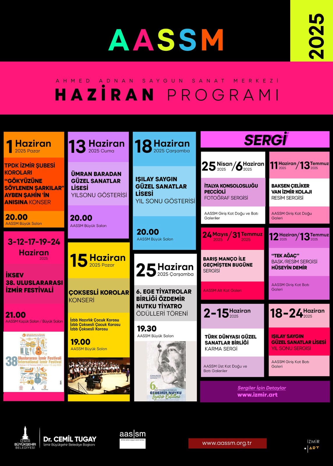 13 Haziran’da Ümran Baradan Güzel Sanatlar Lisesi öğrencileri yıl sonu gösterilerini sahneye taşırken, 15 Haziran’da İzmir Büyükşehir Belediyesi Hazırlık ve Çoksesli Koroları, çok sesli müziğin büyüleyici dünyasını izleyicilere sunacak. 18 Haziran’da ise Işılay Saygın Güzel Sanatlar Lisesi öğrencileri sahne alacak. Ayın son etkinliği 25 Haziran’da düzenlenecek 6. Ege Tiyatrolar Birliği Özdemir Nutku Tiyatro Ödülleri Töreni olacak.