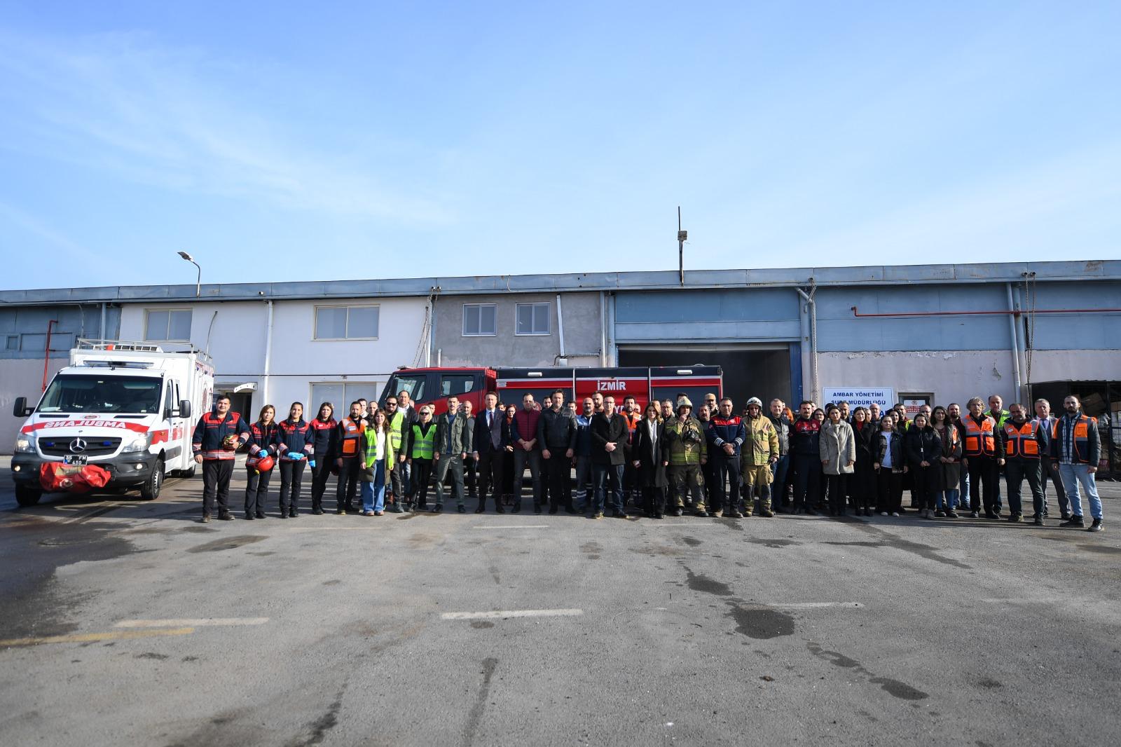 İzmir Büyükşehir Belediyesi Afet İşleri Dairesi Başkanlığı ve İtfaiye Dairesi Başkanlığı olası afetlere karşı hazırlıklı olmak amacıyla Bornova Aşık Veysel Rekreasyon Alanı’ndaki Buz Sporları Salonu ile ESHOT Genel Müdürlüğü’nün Gediz Ağır Bakım Tesisleri’nde deprem ve yangın tatbikatı yaptı. Senaryoya göre İzmir’de 6.1 büyüklüğünde deprem meydana geldi. Buz Sporları Salonu’nda bulunan personel “çök-kapan-tutun” yöntemiyle kendilerini koruyarak raflardan düşen malzemelere karşı önlem aldı. Sarsıntının sona ermesinin ardından, acil durum ekiplerinin yönlendirmesiyle yurttaşlar bina dışına çıkarıldı. Tahliye sırasında binada bulunan çay ocağının elektrik aksamından yangın çıktığı belirlendi. Yangın alarmı çalıştırılarak, 112 Acil Çağrı Merkezi’ne ihbarda bulunuldu. Acil durum ekipleri yangına ilk müdahaleyi yaptı. Toplanma alanında yapılan sayımda iki personelin eksik olduğu belirlendi. Eksik personelden biri, acil durum ekipleri tarafından yaralı şekilde çay ocağından kurtarılarak ilk yardım ekibine teslim edildi. Ancak diğer personel binanın ikinci katında mahsur kaldı. Olay yerine kısa sürede ulaşan itfaiye ekipleri, alevlerin hızla yükseldiği çay ocağındaki yangını kısa sürede kontrol altına aldı ve mahsur kalan personeli merdivenli araç ile güvenli bir şekilde kurtararak sağlık ekiplerine teslim etti.