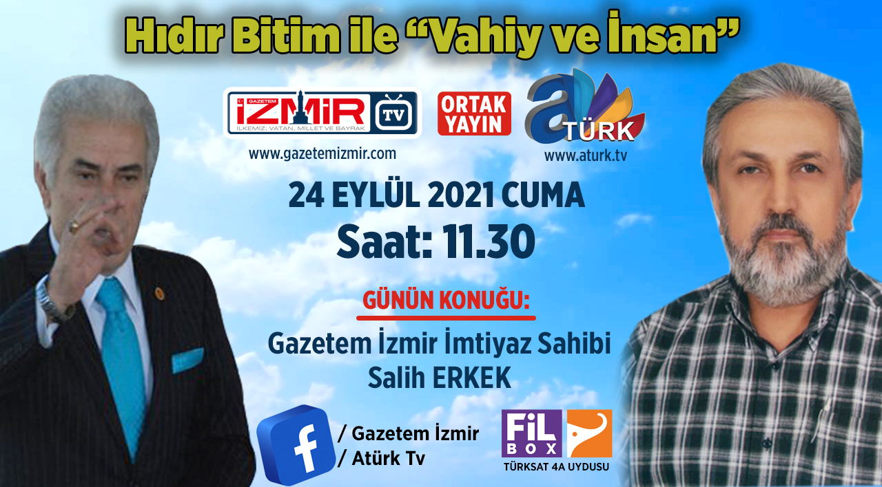 Yapımcılığını ve sunuculuğunu Hıdır Bitim'in üstlendiği 'Vahiy ve İnsan' programının 24 AĞUSTOS 2021 Eylül günü canlı yayınlanacak bölümünün konuğu Gazetem İzmir ve Gazetem İzmir TV İmtiyaz Sahibi Salih Erkek olacak.