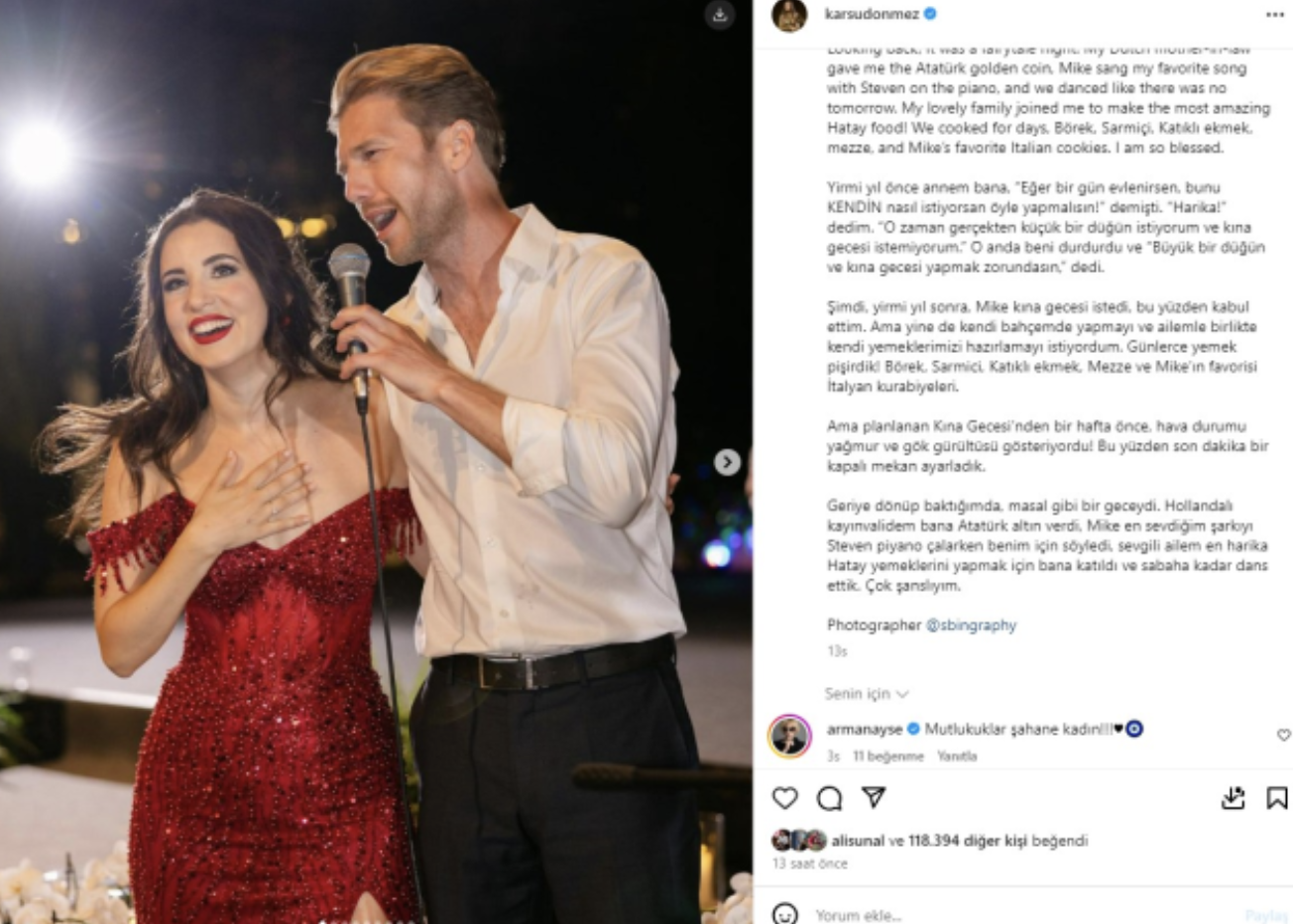 Geleneklerine bağlı şekilde evlenmeyi düşünen Karsu'nun kına gecesinde eğlenceli anlar yaşandı. Aile ve arkadaşlarının katıldığı bir kına organize eden çift, Hatay yemekleri yaptırdı. Kına töreninden kareleri Instagram hesabından yayınlayan Karsu "Yirmi yıl önce annem bana, 'Eğer bir gün evlenirsen, bunu kendin nasıl istiyorsan öyle yapmalısın' demişti. Harika, o zaman gerçekten küçük bir düğün istiyorum ve kına gecesi istemiyorum dedim. O anda beni durdurdu ve 'Büyük bir düğün ve kına gecesi yapmak zorundasın' dedi.