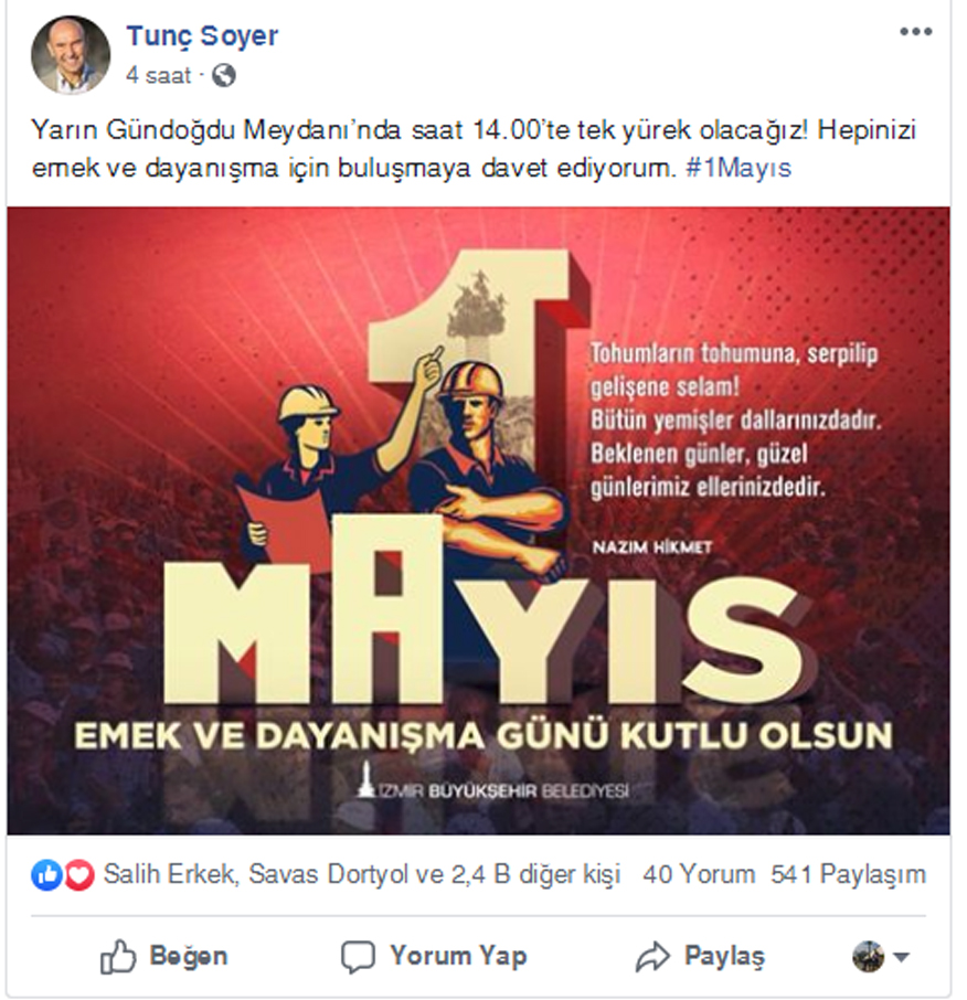 İzmir'de her yıl olduğu gibi 1 Mayıs Emek ve Dayanışma Günü kutlamaları için yine Gündoğdu Meydanı hazırlandı. Tertip komitesinin günler süren çalışmalarından sonra polisle yapılan görüşmeler ışığında katılımcılar için 4 toplanma noktası, 3 de giriş noktası belirlendi. Buna göre geçen yılın aksine Devrimci İşçi Sendikaları Konfederasyonu (DİSK) ve Kamu Emekçileri Sendikaları Konfederasyonu'na (KESK)bağlı sendikalar İkinci Kordon olarak bilinen Cumhuriyet Bulvarı'nda İzmir Ticaret Borsası binası önünde toplanıp gelecekleri Cumhuriyet Meydanı tarafından, Türkiye İşçi Sendikaları Konfederasyonu'na (TÜRK-İŞ) bağlı sendikalar Alsancak Limanı önünden, İzmir Barosu ve bireysel katılımcılar ise Gündoğdu Meydanı'ndan, alana giriş yapacak. Bunun yanı sıra CHP kendi İl binası önünde toplanıp Gazi Osman Paşa Bulvarı'ndan Cumhuriyet Meydanı'na yürüyecek, diğer siyasi partiler ile sivil toplum kuruluşları da Cumhuriyet Meydanı'nda toplanıp alana giriş yapacak.