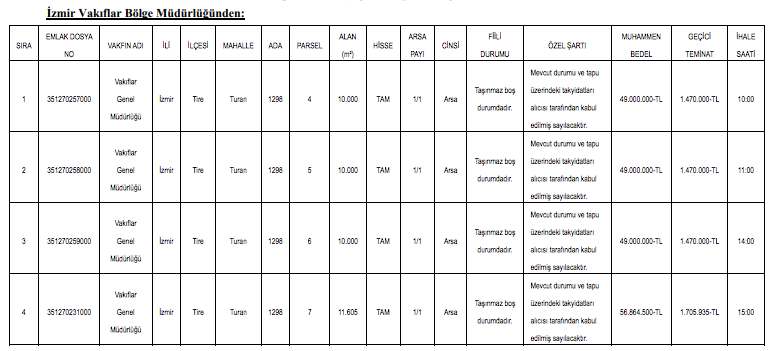 İzmir’in Tire ilçesinde bulunan Turan mahallesindeki arsa cinsindeki taşınmazların toplam muhammen bedeli 203 milyon 864 bin 500 TL olarak belirlendi.