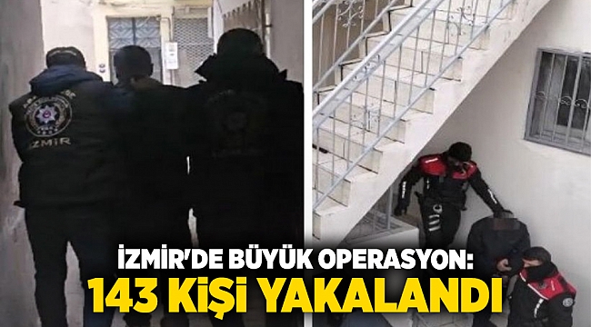 İzmir Emniyet Müdürlüğü ekipleri, il genelinde aranan ve haklarında kesinleşmiş hapis cezası bulunan kişilere yönelik çalışma başlattı. Bu kapsamda dün 103 adrese 264 polisin katılımıyla eş zamanlı operasyon düzenlendi. Operasyonda, 'hırsızlık', 'öldürme', 'yaralama', 'uyuşturucu madde ticareti yapma ve kullanma', 'dolandırıcılık', 'cinsel suçlar' ve 'vergi usul kanununa muhalefet' gibi suçlardan aranan 143 şüpheli yakalandı.