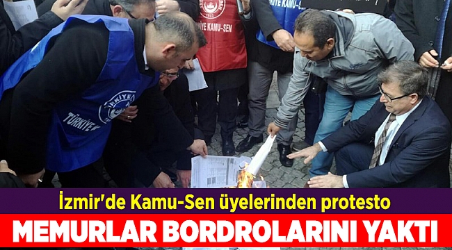 Kamu-Sen İzmir üyeleri, Konak Meydanı'ndaki SGK binası önünde toplanarak, memur maaşlarına yönelik yapılan zamları protesto etti. Ellerinde, 'İnsan gibi yaşamak istiyoruz', 'Memura gelince gıdım gıdım' dövizleri taşıyan yaklaşık 50 sendika üyesi, maaş bordrolarını yaktı. Grup adına basın açıklamasını okuyan Kamu- Sen İzmir İl Temsilcisi İrfan Toksoy, "TÜİK'in resmi rakamlarına göre, geçtiğimiz yıl gıda fiyatları ortalama yüzde 10.9, doğal gaz yüzde 22, elektrik yüzde 18.3 zamlanmışken, maaşlara yüzde 4 zam yapmak adeta memur ve emeklilerle alay etmek demektir. 2019'daki ilk enflasyon hedefine göre maaşlara toplam yüzde 9.2 zam yapılmıştır. 2019 yılında gerçekleşen resmi enflasyon ise yüzde 11.84 olmuştur. Buna göre memur maaşları enflasyonun gerisinden gelmektedir. Kaldı ki, bu oran TÜİK'in enflasyon sepetindeki, çoğunu halkın tüketmediği 418 madde 895 çeşit ürünün ortalama artışını göstermektedir.