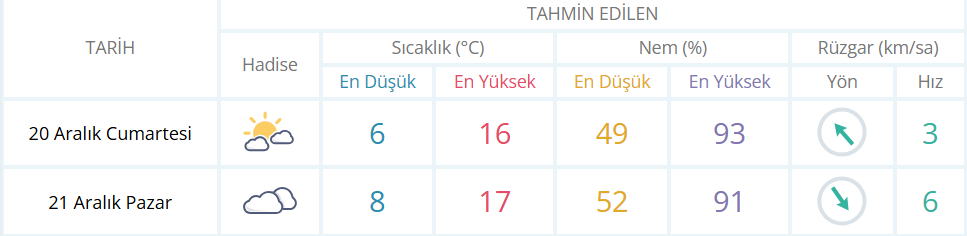 Kente cumartesi (bugün) parçalı bulutlu 16 derece, pazar günü ise çok bulutlu 17 derece olacak. Kentte çarşamba gününe kadar yağmur yağışı beklenmiyor.