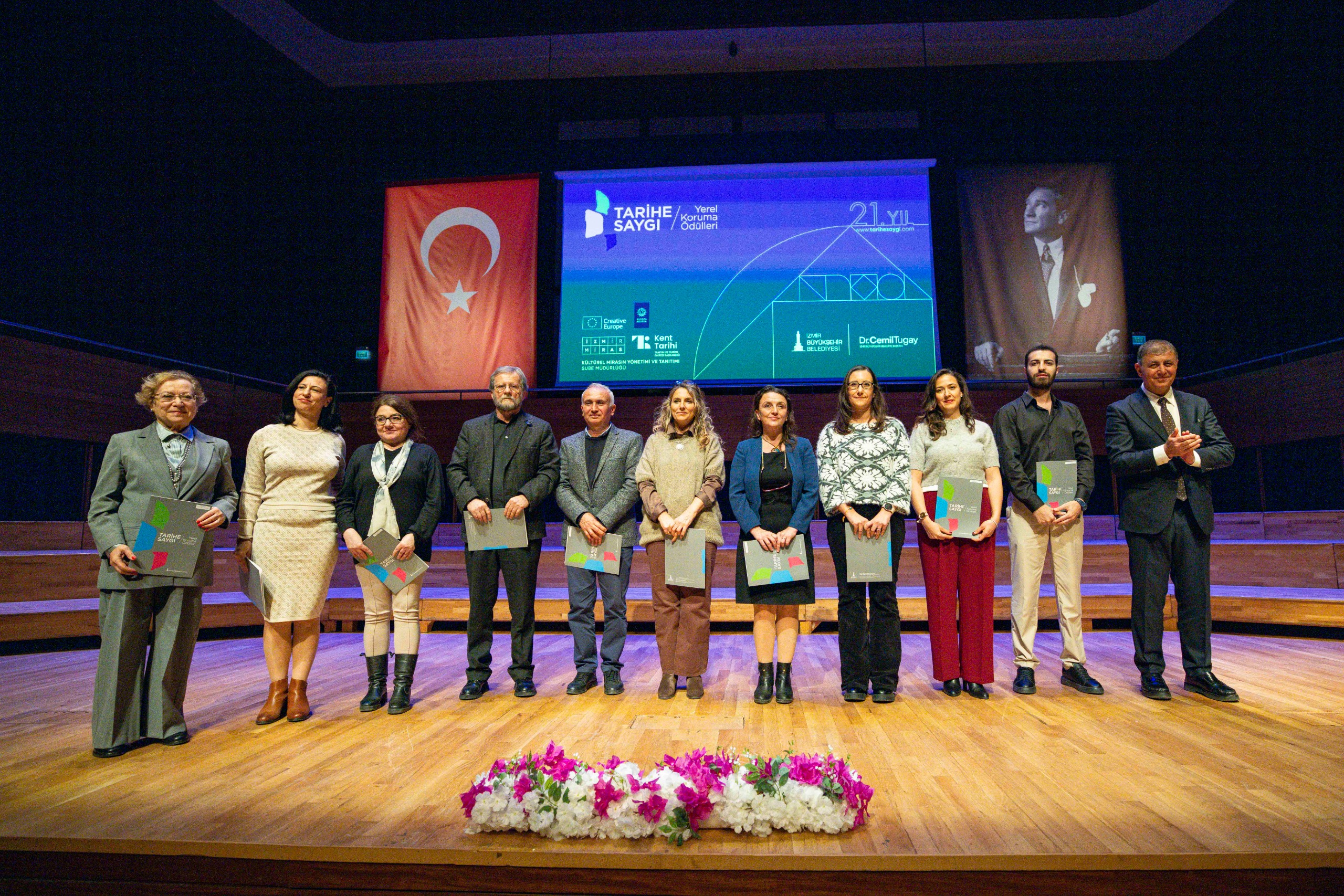 İzmir Büyükşehir Belediyesi Kent Tarihi, Tanıtım ve Turizm Dairesi Başkanlığı tarafından kentteki tarihi ve kültürel mirasa sahip çıkan doğru çalışmaları özendirmek, koruma bilincini yaygınlaştırmak ve olumlu örneklerin çoğalmasını sağlamak amacıyla yapılan Tarihe Saygı Yerel Koruma Ödülleri bu yıl 21’inci kez düzenlendi. İzmir il sınırları içerisinden gelen 72 başvuru değerlendirmeye alındı. Seçici Kurul incelemesi sonucunda ön elemeyi geçen 50 başvuru ödül töreniyle onurlandırıldı. Ahmed Adnan Saygun Sanat Merkezi'nde, İzmir Büyükşehir Belediye Başkanı Dr. Cemil Tugay ev sahipliğinde yapılan törene; Konak Belediye Başkanı Nilüfer Çınarlı Mutlu, Tire Belediye Başkanı Hayati Okuroğlu, Arkas Holding Yönetim Kurulu Başkanı Lucien Arkas ile eşi Merve Arkas, İzmir Büyükşehir Belediyesi Başkan Vekili Dr. Zafer Levent Yıldır, İzmir Büyükşehir Belediye Meclisi Başkanvekili Altan İnanç, İzmir Büyükşehir Belediyesi Genel Sekreteri Zeki Yıldırım, 2025 Seçici Kurul Başkanı Prof. Dr. Nuran Zeren Gülersoy, jüri üyeleri, bürokratlar, meclis üyeleri ve vatandaşlar katıldı. Açılışta Levni Band Grubu, Sami Hosseini şefliğinde Diriliş adlı ritm kompozisyonunu sergiledi.