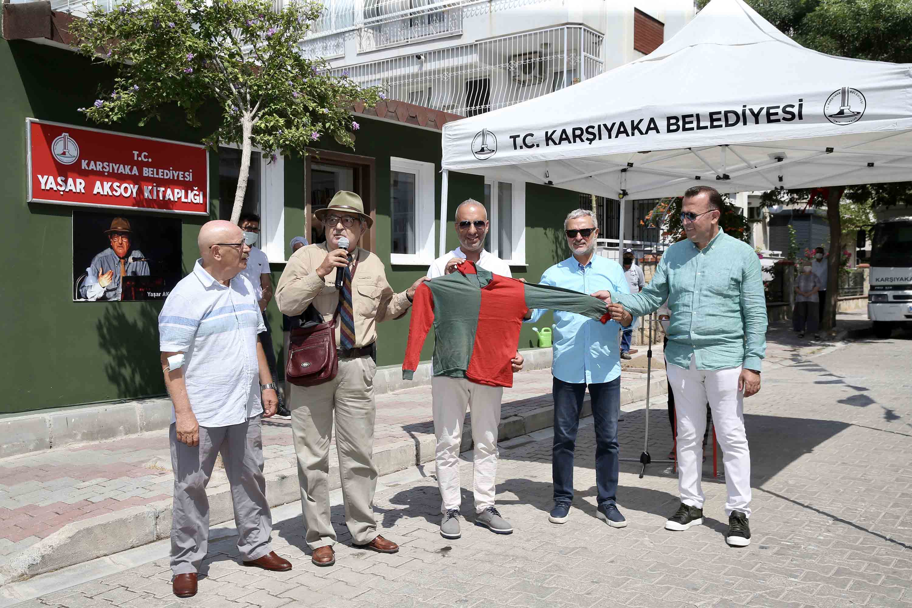 Törende konuşan Yaşar Aksoy, sokağına olan bağlılığını anlatarak, “Bu sokakta osmanlı zamanında Osmanlı Rüştiyesi’nde dedem öğretmendi, daha sonra rüştiye kapandıktan sonra kurulan Kız Muallim Mektebi’nde annem öğretmendi. Annem beni okula götürürdü, ben Karşıyaka Lisesi’nde büyüdüm. Annem dedemle birlikte bu yol üzerinde bir evde otururken babam da o evde yaşamıştır. Ben de doğduktan bir sene sonra bu sokağa taşındım, bu sokaktan okula gittim. 15 yaşındayken mahalle takımı kurduk, formasını hala saklıyorum. İşte ben buyum, sokağıma böyle bağlıyım” diye konuştu. Aksoy daha sonra kitaplığın açılmasına katkı koyan arkadaşlarını yanına çağırarak uzun yıllardır sakladığı ve çocukluğunda giydiği yeşil-kırmızı formayı çantasından çıkararak davetlilere gösterdi.