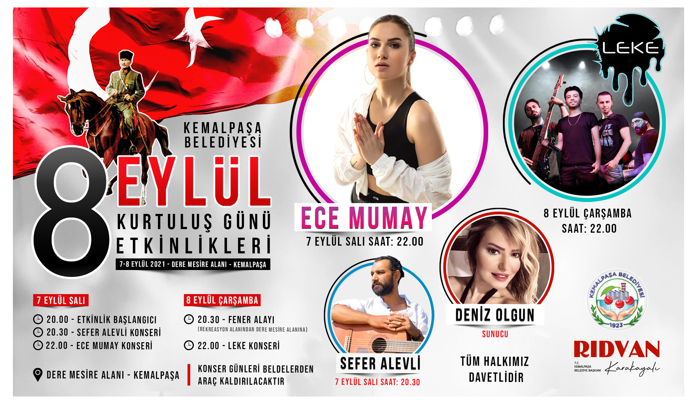 Kemalpaşa Dere Mesire Alanı'nda, 7 Eylül Salı günü saat 20.00'de başlayacak etkinlikler ücretsiz olarak gerçekleşecek. Deniz Olgun'un sunuculuğunu üstleneceği etkinliklerin ilk gününde Sefer Alaylı sahne alacak. Ardından son dönemin sevilen sanatçısı Ece Mumay Kemalpaşalılarla buluşacak. 8 Eylül Çarşamba günü ise, saat 20.30'da başlayacak Fener Alayı Rekreasyon Alanı'ndan Dere Mesire Alanı’na kadar devam edecek. Fener Alayı’nın ardından saat 22.00'de Leke Rock Grubu konseri ile Kemalpaşalılar müzik şöleni yaşayacak. Öte yandan Kemalpaşa Belediyesi Halk Dansı Grubu da gösteri düzenleyeceği etkinliklerde Üretici Kadın Emeği Pazarı da alanda stant açarak el emeği ürünlerini sergileyecek.