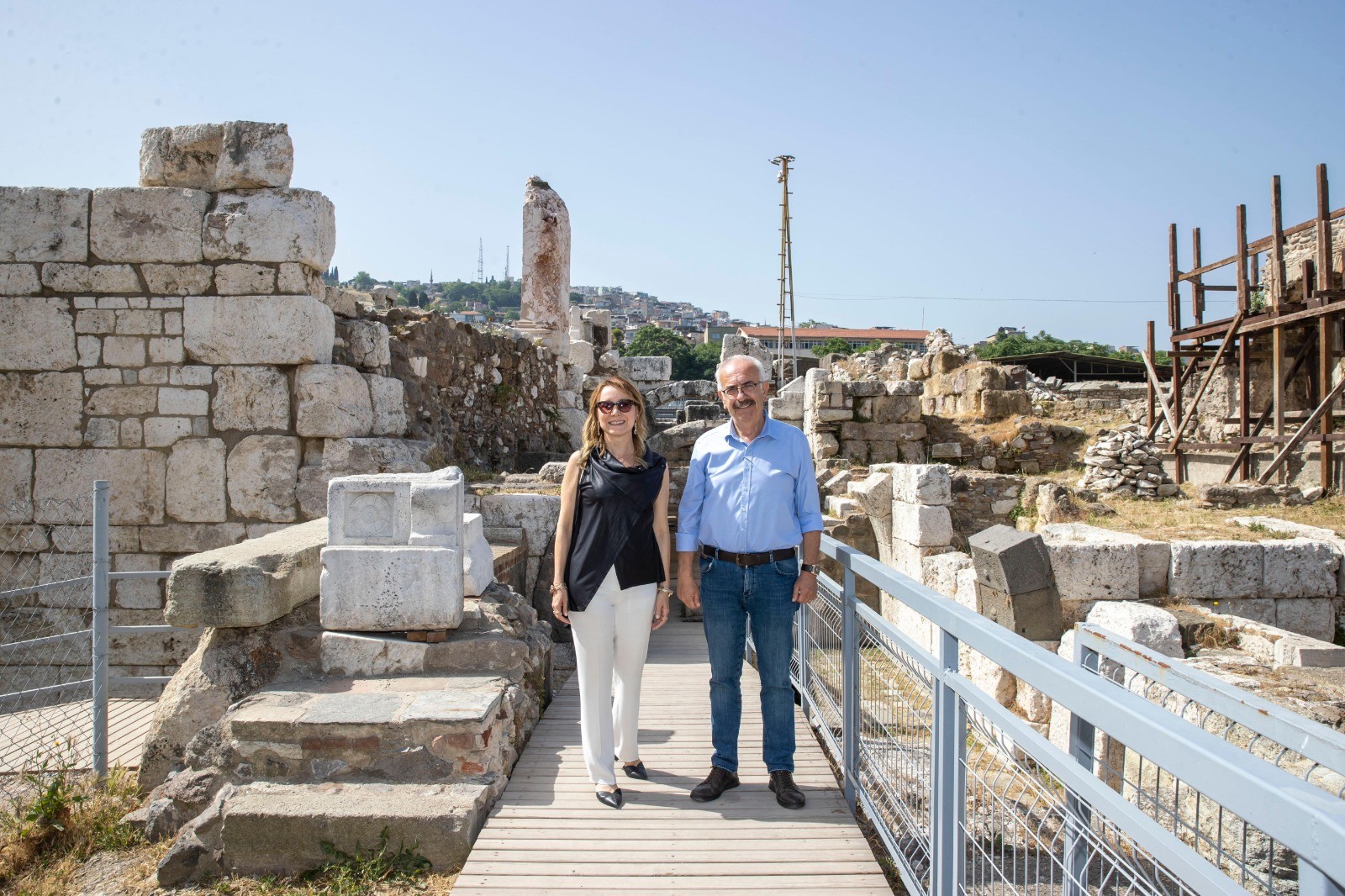 Konak Belediye Başkanı Nilüfer Çınarlı Mutlu, şehrin tarihine ışık tutan Smyrna Agorası’nda Agora Kazı Başkanı Prof. Dr. Akın Ersoy’la bir araya geldi. Smyrna Antik Kenti Kazı Başkanlığı’nda gerçekleşen buluşmada, Agora’nın kent için önemi vurgulanırken önümüzdeki beş yıl boyunca birlikte yapılacak çalışmaların da yol haritası çizildi.