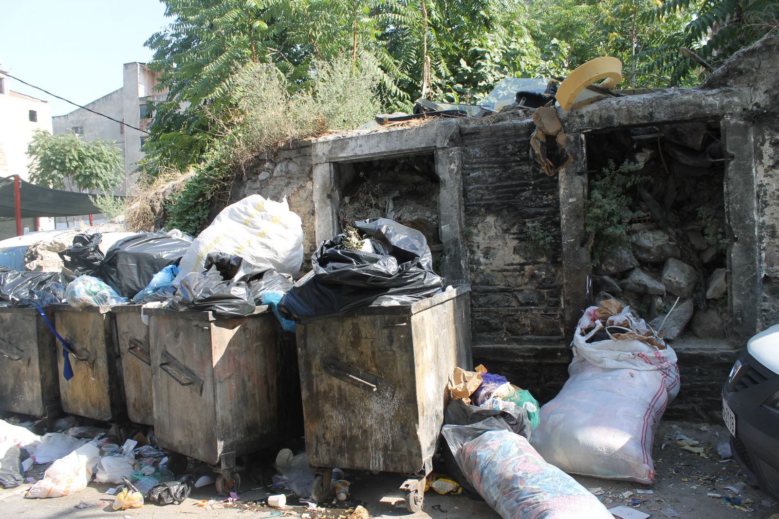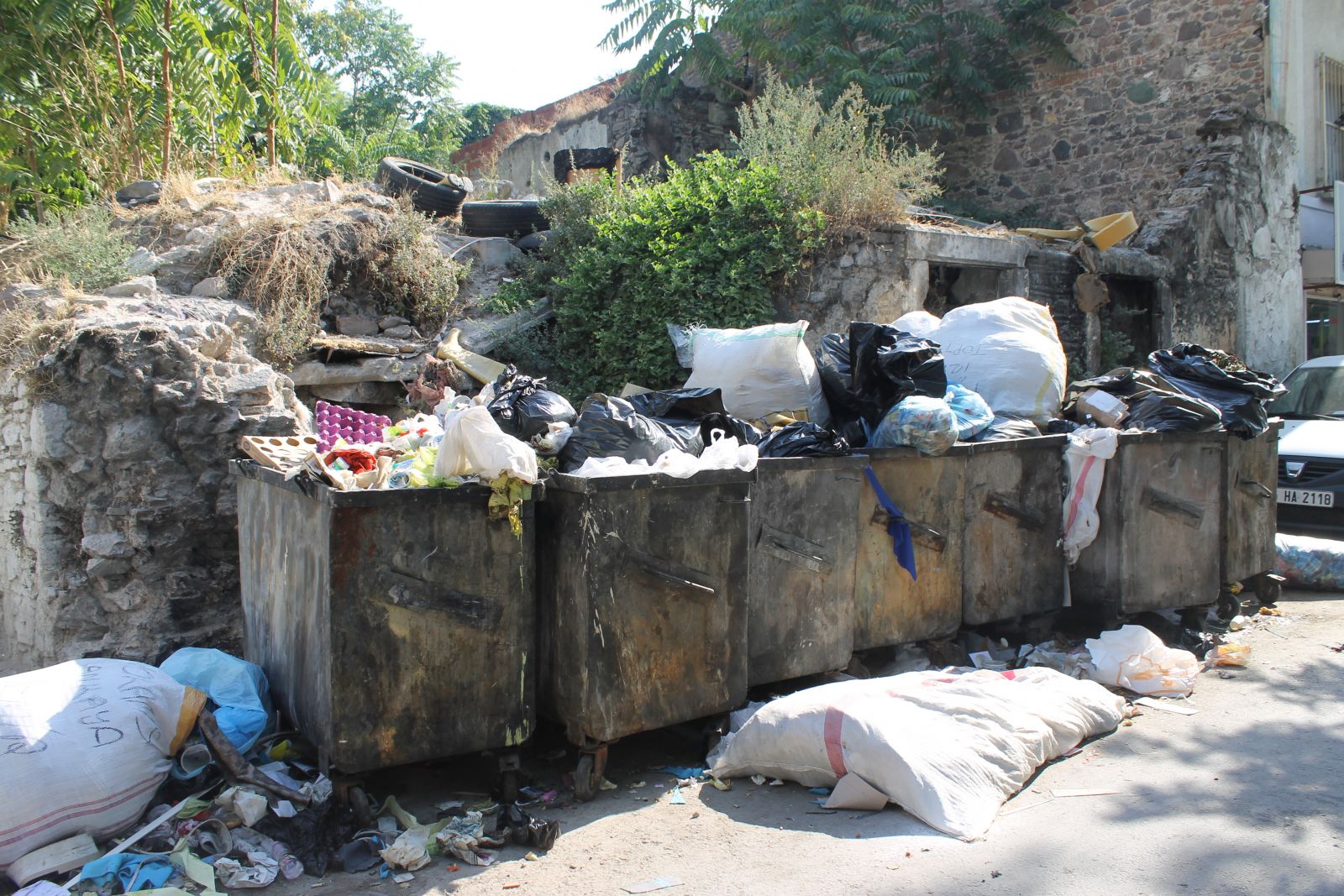Gazetem İzmir / Çağla Vural - Konak Kapılar semti sakinlerinden gelen şikayet üzere olay yerini incelemeye giden muhabirimiz gördükleri karşısında şok oldu. Çöp konteynırlarının yan yana dizilmiş, kapaklarından taşan, insan boyunu aşan çöpleri yerinde resimledik.