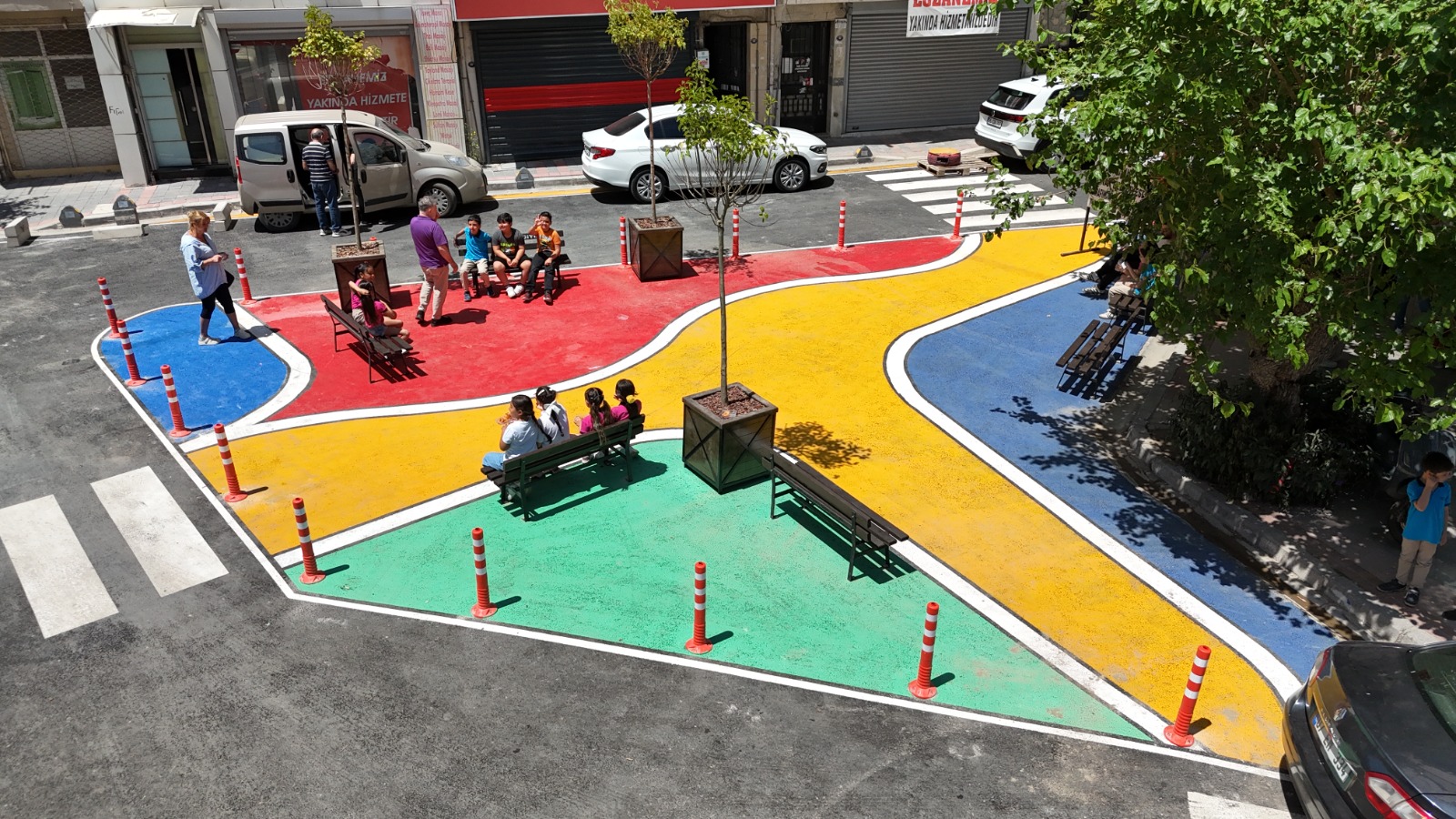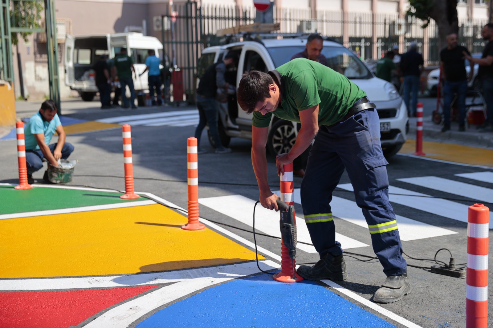 Konak Belediyesi, yaya güvenliğini sağlamak ve sürücülerin farkındalığını artırmak için okul çevrelerinde hayata geçirdiği renkli yol düzenlemelerine devam ediyor. Mehmet Akif Ersoy İlkokulu ve Mimar Sinan Ortaokulu’nun ardından bu kez Kahramanlar Mahallesi’nde eğitim veren Mustafa Öğütveren İlkokulu çevresinde uygulanan düzenleme çocuklara eğlenceli ve güvenli bir okul yolu tasarlandı. Bölgeye yerleştirilen banklar ve ağaçlarla ise vatandaşlara nefes alabilecekleri bir dinlenme alanı oluşturuldu. Çevre sakinleri ve okul önünde bekleyen velilerin büyük beğenisini toplayan düzenleme çalışmaları ilçedeki diğer okullarda da uygulanmaya devam edecek.