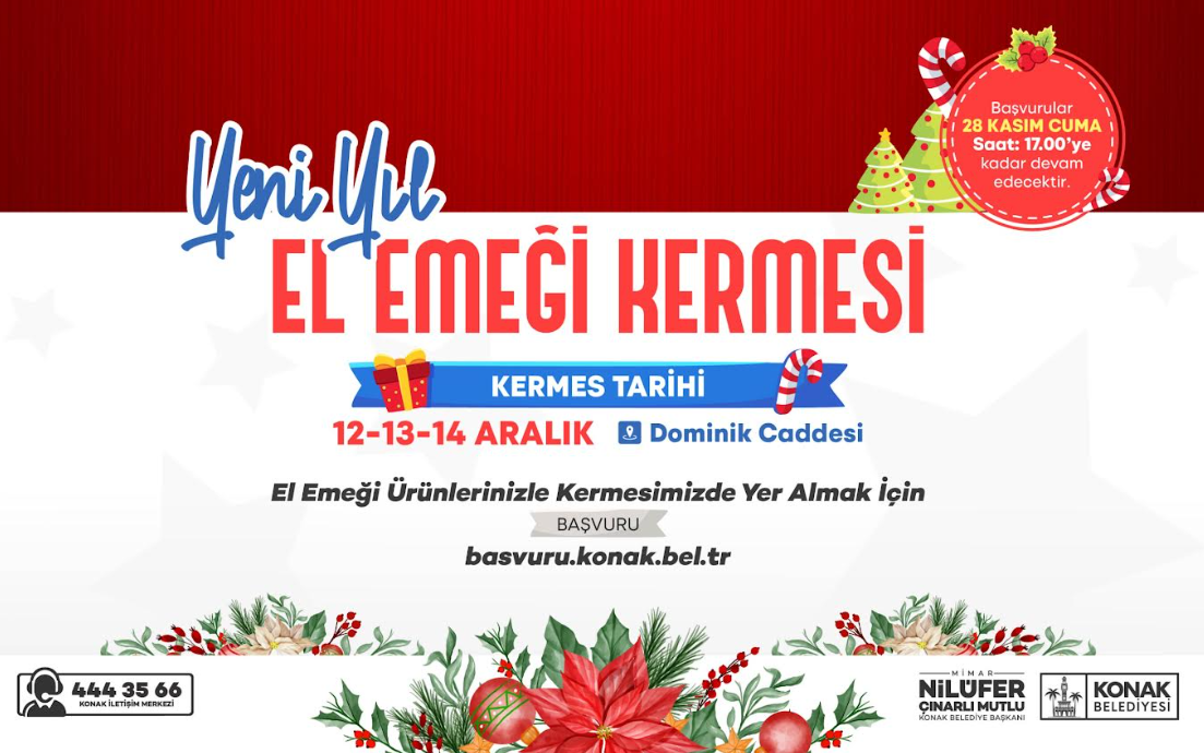 Konak Belediyesi’nin, yılbaşı öncesi kente renk katmanın yanı sıra kadın emeğini görünür kılmak ve kadınlara ekonomik destek sağlamak amacıyla düzenlediği Yılbaşı Kermesleri’ne başvurular başladı. 12-13-14 Aralık tarihlerinde Dominik Caddesi’nde gerçekleştirilecek kermeslerde stant açmak isteyen Konaklılar için son başvuru tarihi 28 Kasım Cuma günü olarak belirlendi. Tamamen el emeği ürünlerden oluşacak kermese başvurular Konak Belediyesi’nin resmi web sitesi üzerinden kabul edilmeye başlandı.