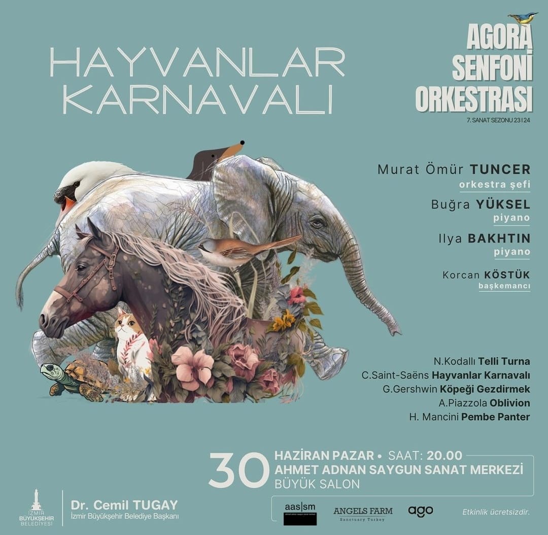 Agora Senfoni Orkestrası (AGO), İzmir Büyükşehir Belediyesi’nin desteğiyle, özellikle ölüme terk edilmiş, şiddete ve istismara uğramış, engelli hayvanlara kucak açan Angels Farm yararına Hayvanlar Karnavalı konseri düzenliyor. Angels Farm, 2018 yılında Kurban Bayramı’nda Rize’den yüzerek Trabzon’a kaçan dana Ferdinand’a ve daha pek çok mağdur hayvana yuva olmasıyla biliniyor. Agora Senfoni Orkestrası da bünyesinde pek çok büyükbaş ve küçükbaş hayvanın barındığı Angels Farm’a destek olmak amacıyla sosyal sorumluluk projesi başlattı. Bu kapsamda, İzmir Büyükşehir Belediyesi ve Başkan Dr. Cemil Tugay’ın katkıları ile 30 Haziran saat 20.00’de Ahmed Adnan Saygun Sanat Merkezi Büyük Salon’da ücretsiz olarak Hayvanlar Karnavalı konseri düzenlenecek.