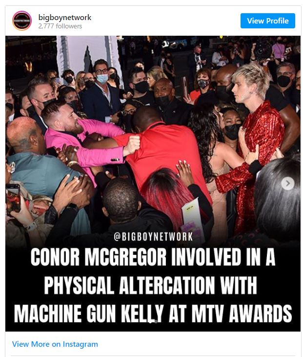 gr Mc Gregor, Machine Gun Kelly ile fotoğraf çektirmek istedi ama Kelly bu talebi reddetti. Ardından ikili arasında bir tartışma çıktı ve Kelly Conor Mc Gregor'u itip tökezlemesine sebep oldu.