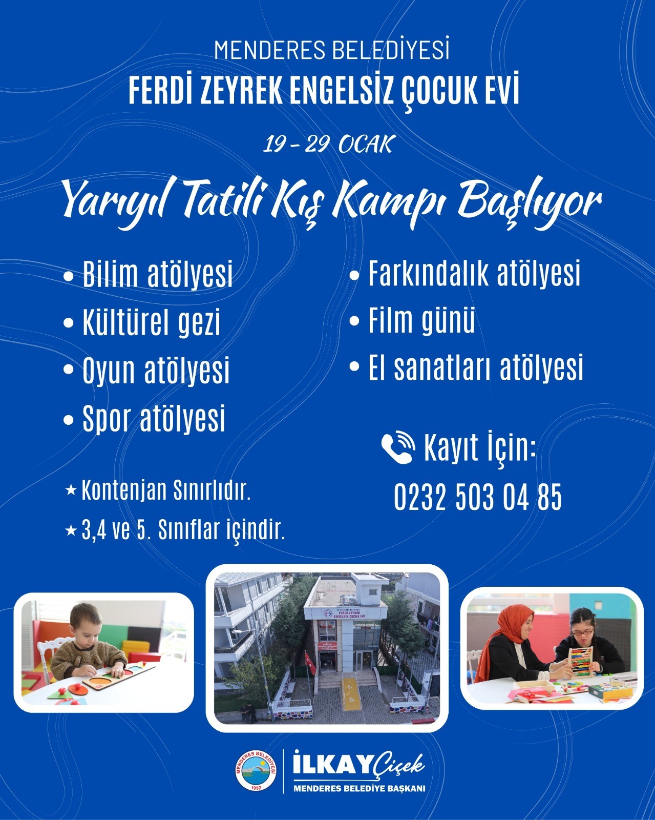 Menderes Belediyesi, yarıyıl tatilinde çocuklar için bir etkinlik daha düzenliyor. Kültür Sanat ve Sosyal İşler Müdürlüğü’nün düzenleyeceği Yarıyıl Tatili Kış Kampı 19-29 Ocak tarihleri arasında Menderes Belediyesi Ferdi Zeyrek Engelsiz Çocuk Evi’nde olacak. 3., 4. ve 5. Sınıflara giden çocukların katılabileceği kampta birbirinden eğlenceli etkinlikler düzenlenecek. Bilim atölyesi, farkındalık atölyesi, el sanatları atölyesi, oyun atölyesi, spor atölyesi ve film günü gibi etkinliklerle çocuklar keyifli vakit geçirecek. Yapılan duyuruda; kayıt için 0232 503 04 85 numaralı hattan kayıt yaptırılabileceği ifade edildi.