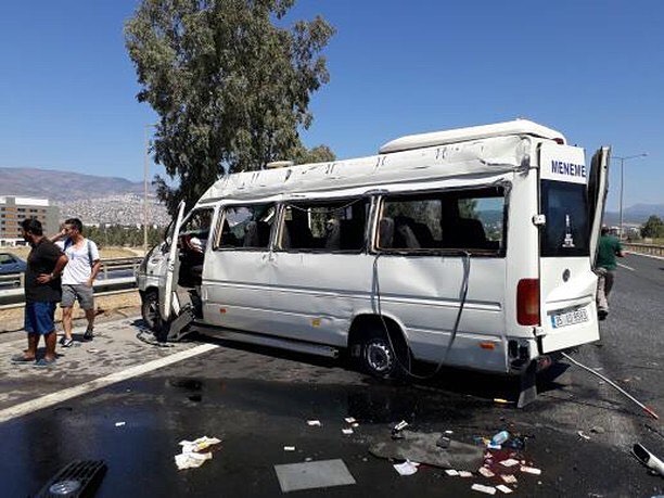 İzmir’de taşımacılık yapan Menemen-Otogar hattına ait minibüs kamyona arkadan çarpınca takla attı. İddiaya göre Bornova’dan garaj istikametine giden ve ve daha fazla yolcu almak için yarış halinde olan 2 Menemen dolmuşundan biri seyir halinde olan bir kamyona arkadan çarparak takla attı. Bugün öğle saatlerinde meydana gelen kazada 10 kişi yaralanırken yaralılar bölgeye sevk edilen ambulanslarla çevre hastanelere sevk edildi. Kaza mahaline meydana gelen olay sonrasında çok sayıda emniyet güçleri de sevk edilirken ilk belirlemelere göre kazada hayatını kaybeden olmadı.