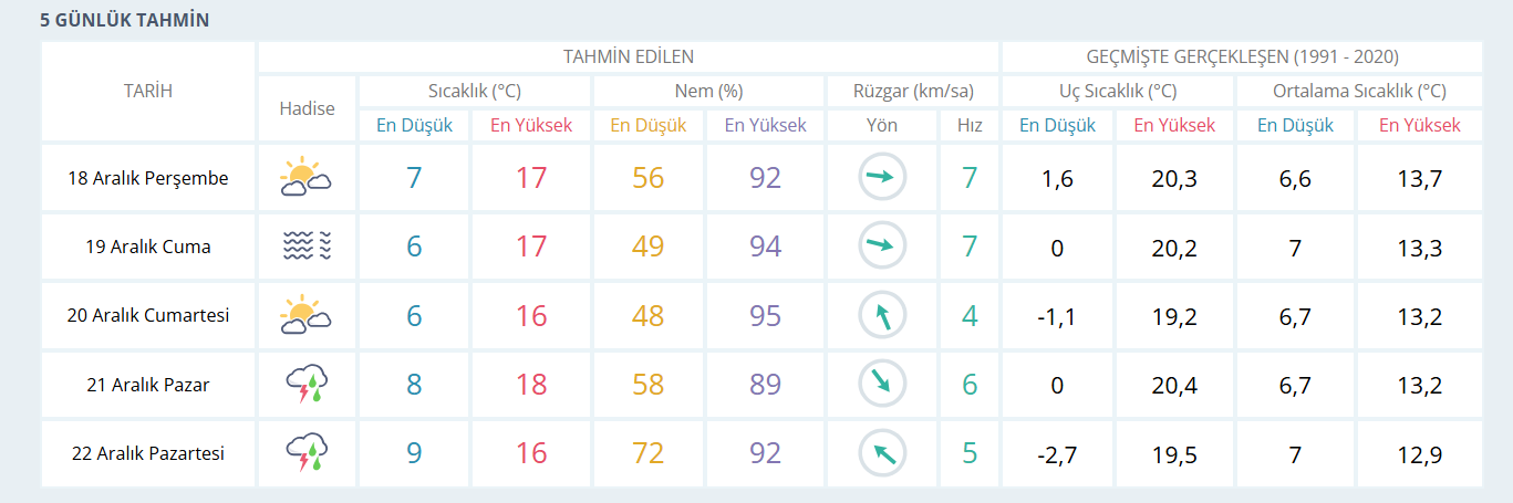 Meteoroloji Genel Müdürlüğü verilerine göre İzmir’de 18 Aralık Perşembe günü hava sıcaklığı 17 derece olacak ve gün boyunca bulutlu bir hava etkili olacak. 19 Aralık Cuma günü puslu bir hava beklenirken sıcaklık 17 derece seviyesinde seyredecek. 20 Aralık Cumartesi günü ise hava sıcaklığının 16 dereceye düşmesi öngörülüyor.