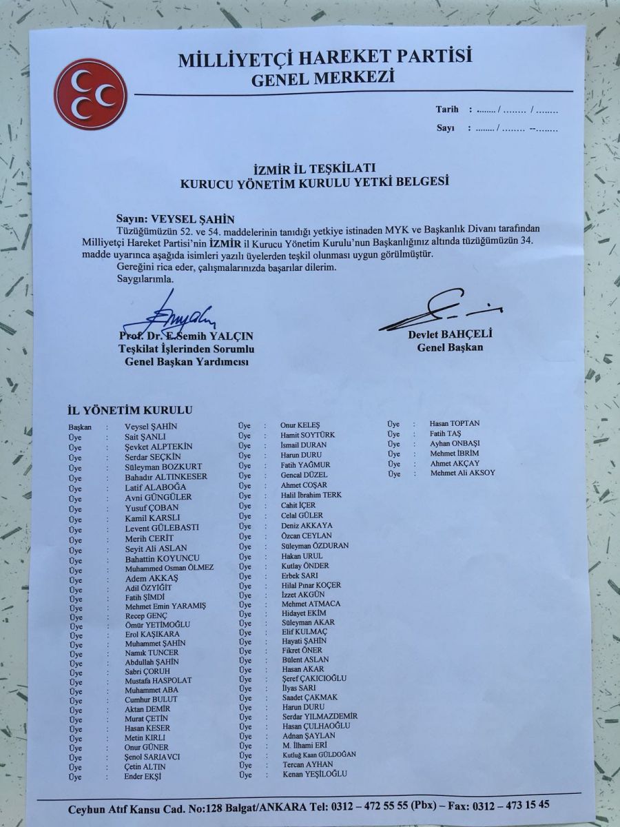 MHP Genel Başkanı Devlet Bahçeli ve MHP Teşkilat İşlerinden Sorumlu Genel Başkan Yardımcısı Prof. Dr. E. Semih Yalçın imzalı MHP İzmir İl Yönetim Kurulu listesine giren isimler şu şekilde oldu;