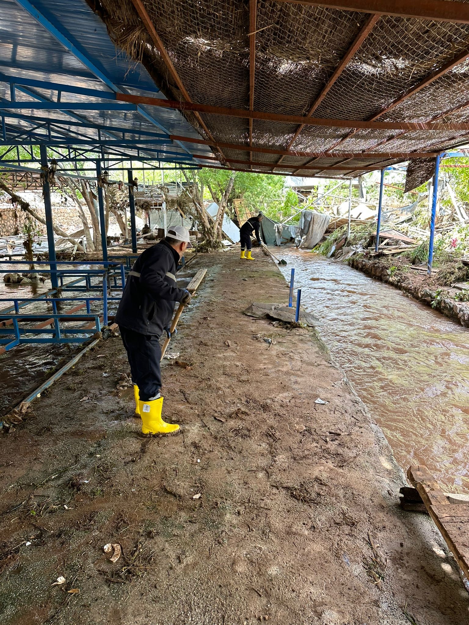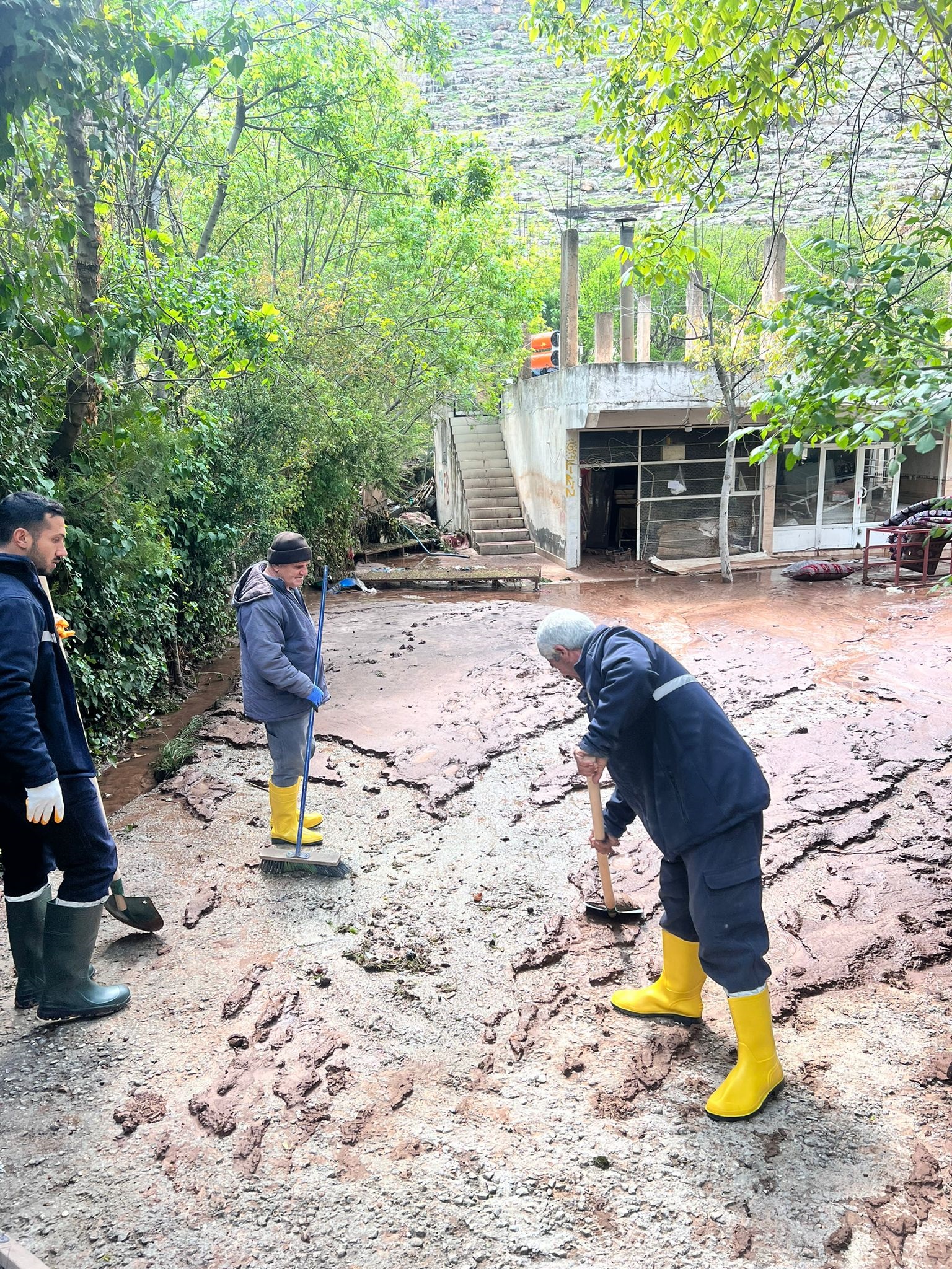 Bu kapsamda 4 iş makinası ve 15 personelle taşkın dolayısıyla Beyazsu ve etrafından bulunan alanlar, çardaklar, tahtlar, cadde ve sokaklar çamurdan temizlenirken işyerlerine dolan sular boşaltılıyor. Suyun sürükleyerek getirdiği taş, kaya, ağaç ve molozlar iş makinesi aracılığıyla kaldırılıyor.