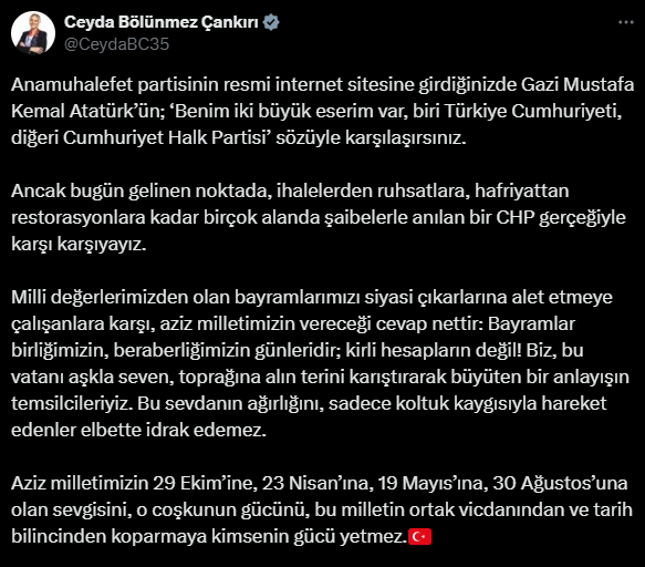 “CHP’nin resmi internet sitesinde Atatürk’ün ‘Benim iki büyük eserim var, biri Türkiye Cumhuriyeti, diğeri Cumhuriyet Halk Partisi’ sözü yer alıyor. Ancak bugün bakıldığında, birçok alanda şaibelerle anılan bir CHP gerçeğiyle karşı karşıyayız,” ifadelerini kullandı.