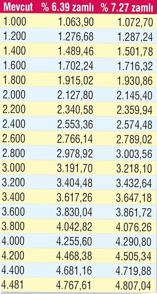 Bu maaş, yüzde 6.39`luk 5 aylık enflasyona göre 286,35 lira artışla 4 bin 767 lira 61 kuruşa çıkıyor. Eğer zam oranı yüzde 7.27 olarak gerçekleşirse bu maaş 325,78 lira artışla 4 bin 807 lira 4 kuruşa yükselecek.