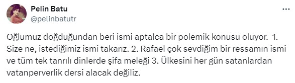 Zaman zaman oğluna verdiği isimden dolayı gündeme gelen Pelin Batu, X hesabından yaptığı paylaşımda eleştirilere cevap verdi. Oğluna sevdiği bir ressamın adını verdiğini söyleyen Batu, "Oğlumuz doğduğundan beri ismi aptalca bir polemik konusu oluyor. 1. Size ne, istediğimiz ismi takarız. 2. Rafael çok sevdiğim bir ressamın ismi ve tüm tek tanrılı dinlerde şifa meleği. 3. Ülkesini her gün satanlardan vatanperverlik dersi alacak değiliz" ifadelerini kullandı.