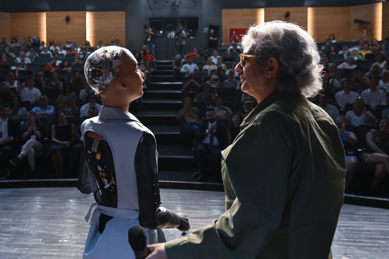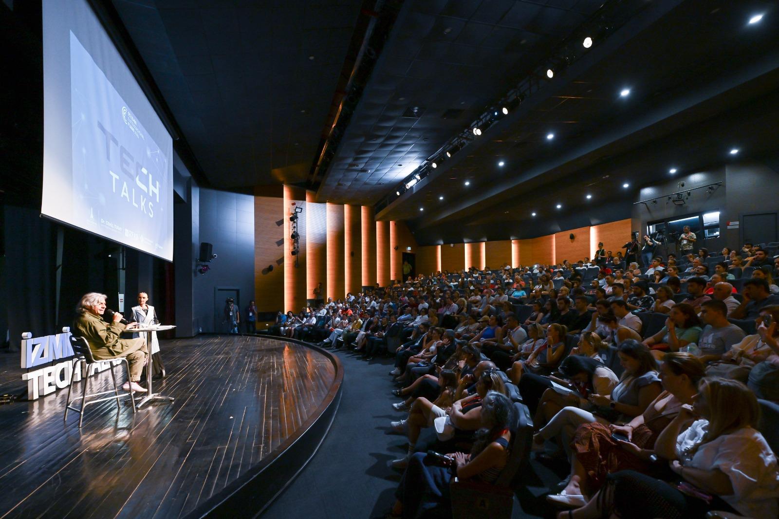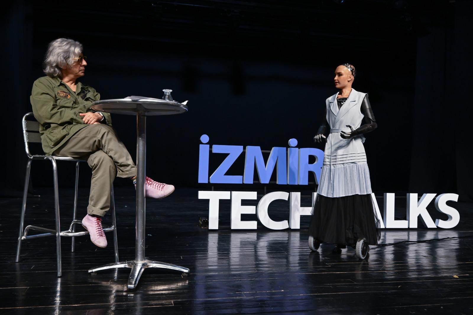 İzmir Büyükşehir Belediyesi’nin ev sahipliğinde “Teknoloji” temasıyla ve “Zamanın Ötesine Geçiyoruz” sloganıyla 93’üncü kez kapılarını açan İzmir Enternasyonal Fuarı kapsamında İZFAŞ ile İzmir İnovasyon ve Teknoloji AŞ iş birliğiyle düzenlenen “TechTalks” etkinliği İsmet İnönü Sanat Merkezi’nde önemli isimleri İzmirliler ile buluşturmayı sürdürüyor. Etkinlik kapsamında bir gün önce tarihçi Prof. Dr. Emrah Safa Gürkan ile sahneye çıkan insansı robot Sophia bu kez de Okan Bayülgen ile bir araya geldi.