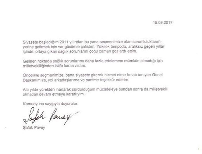 Sol kolu ve sol bacağı protez olan CHP Milletvekili Şafak Pavey, sağllık sorunlarını gerekçe göstererek milletvekililğinden istifa etti.