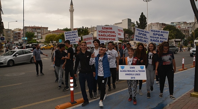 İlçe Sağlık Müdürlüğü tarafından Sağlık Bakanlığı'nın '10 Mayıs Dünya Sağlık İçin Hareket Et Günü kapsamında sağlıklı yaşam yürüyüşü gerçekleştirerek yürüyüş tertiplediklerini belirten İlçe Sağlık Müdürlüğü Doktoru Sinan Oğuzhan, "En kolay spor 5 kilometreyi yani 10 bin adım yürümeyi tavsiye ediyoruz. Aliağa'da uygun yürüme alanları var. Obeziteyi önlemekte en etkili yöntem spor yapmak ve yürüyüş yapmaktır. Obezite birçok hastalıklara temel oluşturuyor. Asıl amacımız; bununla mücadele etmektir. Bununla mücadele yaparken yürüyüşün başka faydaları da bulunmaktadır. Depresyona bile fayda geldiği söyleniyor. Bu gün Aliağa Mesleki ve Teknik Anadolu Lisesi öğrencileri ile birlikte farkındalık için böyle bir yürüyüş düzenledik. Tüm halkımızı bundan sonra 10 bin adım yani 5 kilometreyi yürümeyi tavsiye ediyoruz. 10 Mayıs, 12 Haziran Dünya Sağlıklı Hareketler günleri gibi böyle günlerde biz özellikle farkındalık için öğrencileri de yanımıza alarak, uzun mesafeler değil ama, pankartlarımızla vatandaşlara bilgiler vermeye çalışarak onları spora teşvik etmeye çalışıyoruz" dedi.
