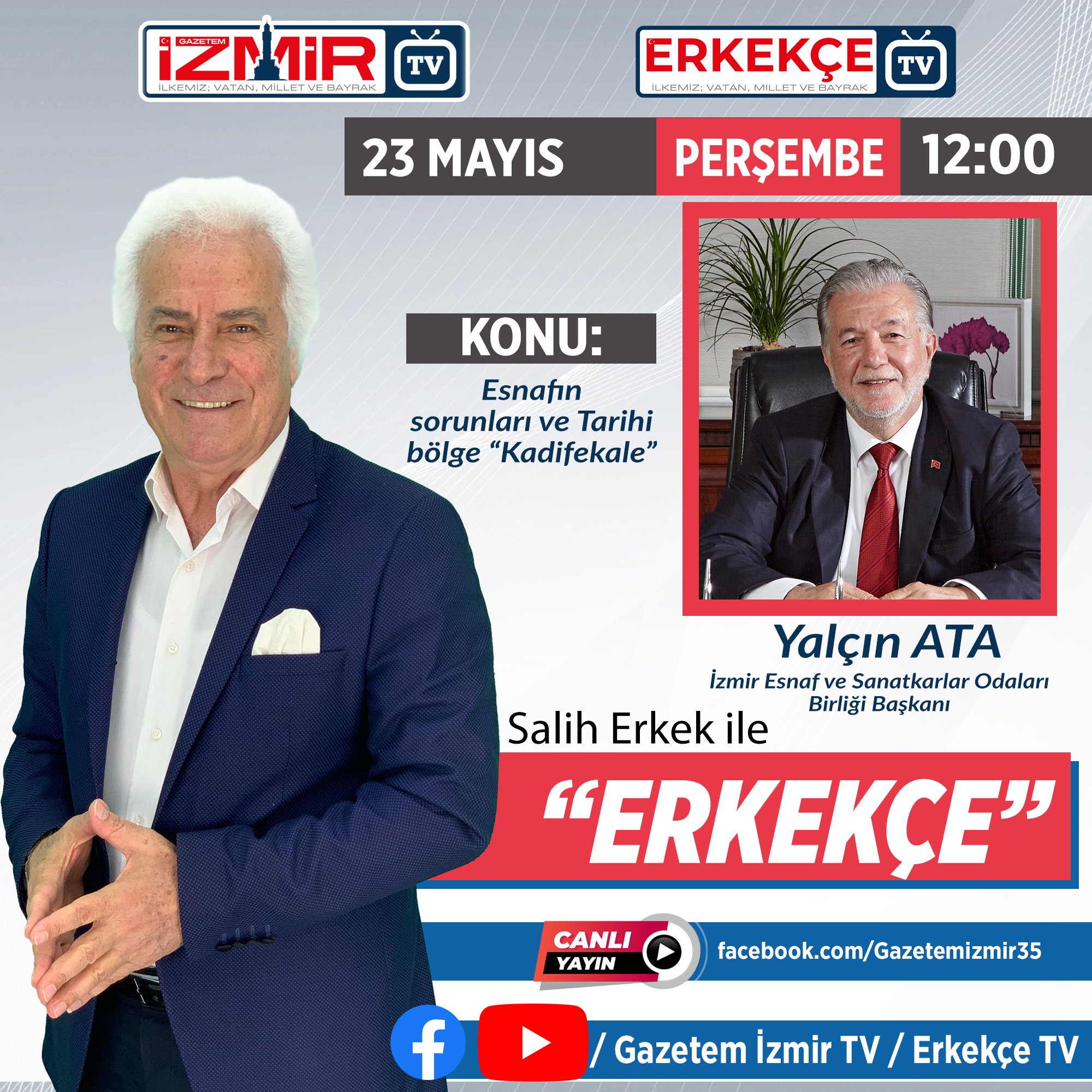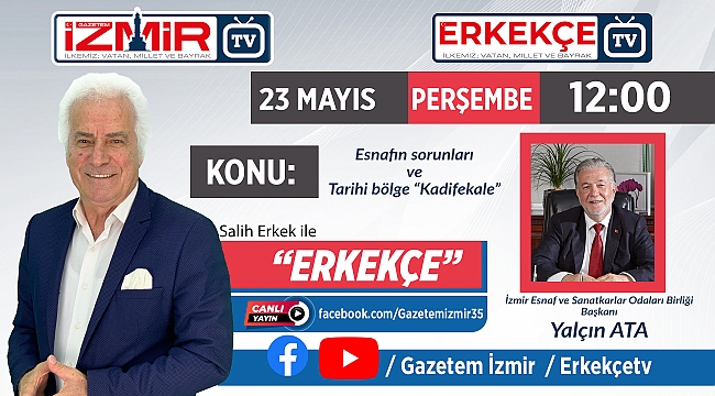 GAZETEM İZMİR TV, ERKEKÇE TV ve GAZETEM İZMİR İnternet Haber Portalı İmtiyaz Sahibi Salih ERKEK, 23 Mayıs (bugün) saat 12:00'de yapımcılığını ve sunuculuğunu üstlendiği Erkekçe programında, İzmir Esnaf ve Sanatkarlar Odaları Birliği Başkanı Yalçın ATA'yı konuk edecek. Program, Gazetem İzmir TV Facebook hesabından canlı yayınlanırken, "Esnafın sorunları ve Tarihi Bölge "Kadifekale"" konuları ele alınacak.