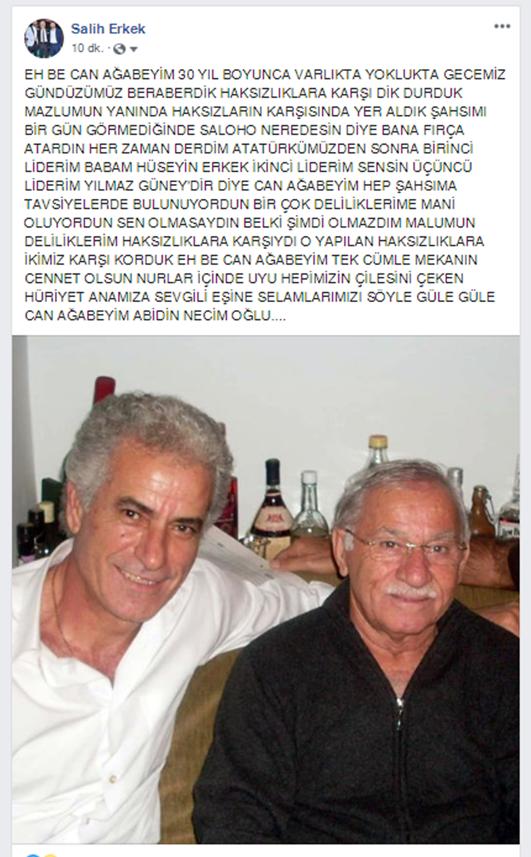 30 yılı aşkın ağabey kardeş ilişkisi yaşadığı büyüğünün kaybını yaşayan Erkek sosyal medya hesabından şu sözlerle paylaşım yaptı: “EH BE CAN AĞABEYİM 30 YIL BOYUNCA VARLIKTA YOKLUKTA GECEMİZ GÜNDÜZÜMÜZ BERABERDİK HAKSIZLIKLARA KARŞI DİK DURDUK MAZLUMUN YANINDA HAKSIZLARIN KARŞISINDA YER ALDIK ŞAHSIMI BİR GÜN GÖRMEDİĞİNDE SALAHO NEREDESİN DİYE BANA FIRÇA ATARDIN HER ZAMAN DERDİM ATATÜRKÜMÜZDEN SONRA BİRİNCİ LİDERİM BABAM HÜSEYİN ERKEK İKİNCİ LİDERİM SENSİN ÜÇÜNCÜ LİDERİM YILMAZ GÜNEY'DİR DİYE CAN AĞABEYİM HEP ŞAHSIMA TAVSİYELERDE BULUNUYORDUN BİR ÇOK DELİLİKLERİME MANİ OLUYORDUN SEN OLMASAYDIN BELKİ ŞİMDİ OLMAZDIM MALUMUN DELİLİKLERİM HAKSIZLIKLARA KARŞIYDI O YAPILAN HAKSIZLIKLARA İKİMİZ KARŞI KORDUK EH BE CAN AĞABEYİM TEK CÜMLE MEKANIN CENNET OLSUN NURLAR İÇİNDE UYU HEPİMİZİN ÇİLESİNİ ÇEKEN HÜRİYET ANAMIZA SEVGİLİ EŞİNE SELAMLARIMIZI SÖYLE GÜLE GÜLE CAN AĞABEYİM ABİDİN NECİMOĞLU....