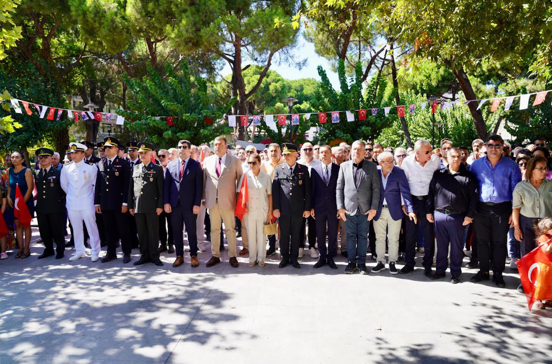 Tören, Seferihisar Belediye Bandosu eşliğinde saygı duruşu ve İstiklal Marşı’nın okunmasıyla başladı. Ardından Atatürk Anıtı’na çelenk sunuldu.