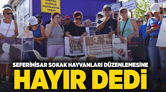 Eyleme katılarak yasanın Seferihisar’da asla uygulanmayacağının altını çizen Belediye Başkanı İsmail Yetişkin “Öncelikle katliam yasası dediğimiz yasaya karşı verdiğiniz mücadele için hepinize çok teşekkür ederim. Bu mücadele vicdanı olan herkesin vermesi gereken bir mücadeledir. Şimdi yasayı geçirdiler. Fakat kimse bizden sokaktaki masum canları toplayıp öldürmemizi beklemesin. Biz öldüren değil yaşatan taraftayız. Bu süreçte hepimize büyük yükler düşüyor. Sokaktaki hasta ve yardıma muhtaç hayvanlar için daha fazla mücadele etmeliyiz. Daha büyük bir dayanışma göstermeliyiz. Katliam yasasının uygulanmasına engel olacağız” diye konuştu.