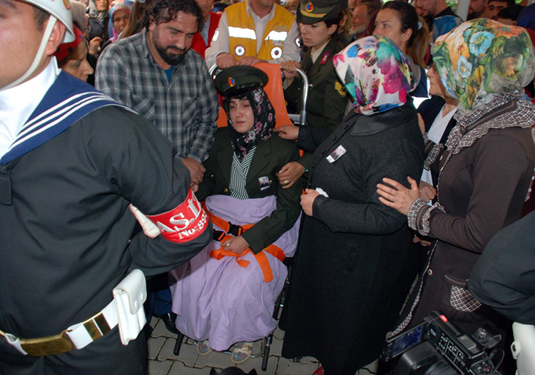 Şehidin 8,5 aylık hamile olan eşi Melek Şenözüar ise 112 acil ekipleri tarafında sedye üzerinde getirildi. Eşinin naaşını görünce gözyaşlarına boğulan genç kadın, üzerine eşinin ceketini giyip, şapkasını taktı. Şehidin kız kardeşi Merve Şenözüar, şehit eşinin koluna girerek teselli etti. Şehidin annesi Fatma ve babası Hamdi Şenözüar da gözyaşlarını tutamadı.