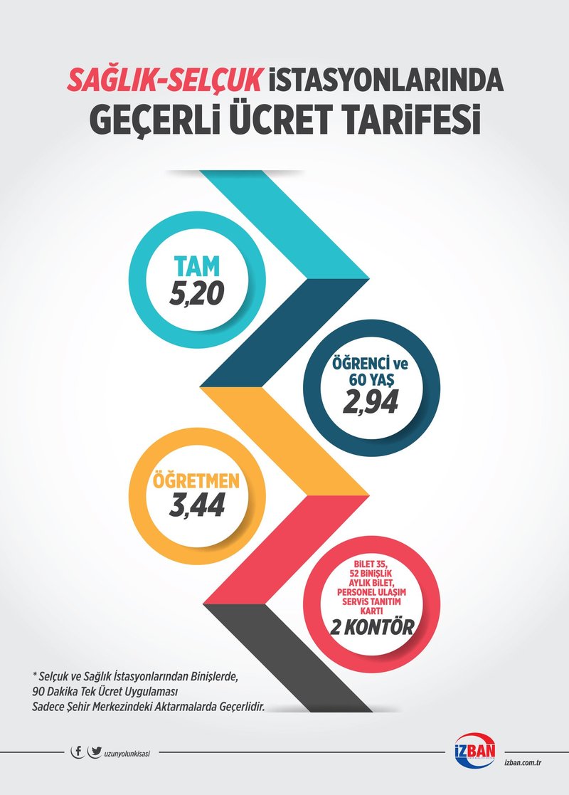 Sağlık-Selçuk istasyonlarını kullanacak için tam 5,20 TL, öğrenci ve 60 yaş üzerin vatandaşlar için 2,94 TL ücret belirlendi. Öğretmen tarifesi 3,44 TL, Bilet 35, 52 binişlik aylık bilet ve personel ulaşım servis kartı tarifesi ise 2 kontör olarak belirlendi.