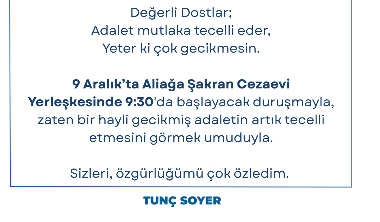 Soyer, 9 Aralık’ta Aliağa Şakran Cezaevi Yerleşkesinde saat 09.30’da görülecek duruşma öncesinde adalet vurgusu yaparak şu ifadeleri kullandı: