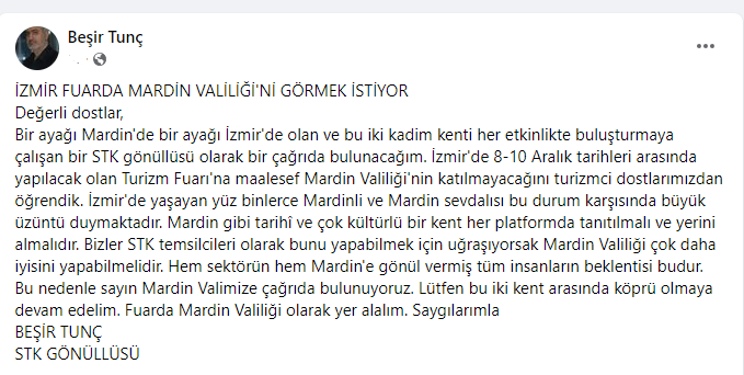Gazetem İzmir / Yusuf ERKEK - İzmir'de birçok STK'da görev yapan, geçmiş dönemlerde İzmir Mardinliler Federasyonu Genel Başkanlık görevini de yürüten, hali hazırda Alıçlılar Derneği Başkanlığı'nı yapan STK Gönüllüsü Beşir Tunç kişisel sosyal medya hesabından yaptığı açıklamayla İzmir'de yapılacak Turiz Fuarı'nda Mardin Valiliği'ni görmek istediklerini açıkladı.