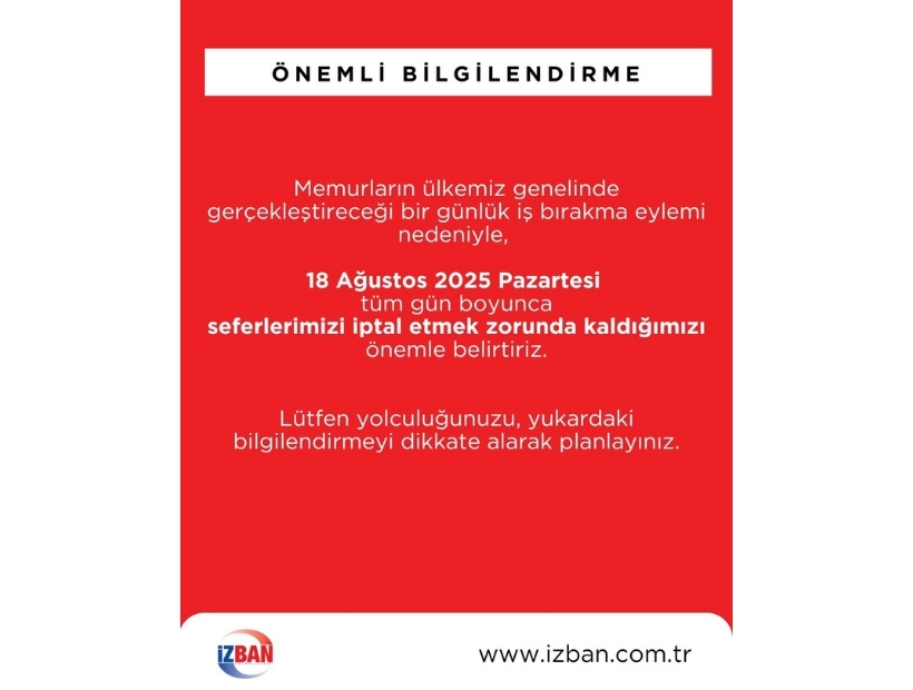İş bırakma eyleminin duyurusunun gece saatlerinde yapılması nedeniyle iş bırakma eylemine hazırlıksız yakalanan vatandaşlar, alternatif toplu taşıma araçlarının yolunu tuttu. İZBAN'dan yapılan açıklamada, "Memurların ülke genelinde gerçekleştireceği 1 günlük iş bırakma eylemi nedeniyle TCDD çalışanları işbaşı yapmayacaktır. Bu nedenlerden dolayı 18 Ağustos 2025 Pazartesi tüm gün boyunca seferlerimizi iptal etmek zorunda kaldığımızı önemle belirtiriz" denildi. (DHA)