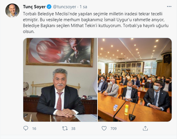 "Torbalı Belediye Meclisi'nde yapılan seçimle milletin iradesi tekrar tecelli etmiştir. Bu vesileyle merhum başkanımız İsmail Uygur'u rahmetle anıyor, Belediye Başkanı seçilen Mithat Tekin'i kutluyorum. Torbalı'ya hayırlı uğurlu olsun."