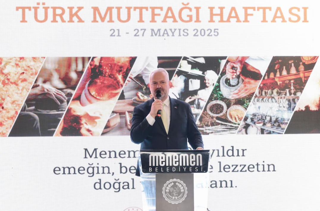Menemen’e ilişkin tanıtım filminin izlenmesiyle başlayan programda Menemen Belediye Başkanı Aydın Pehlivan, Menemen’in 8000 yıllık tarihiyle sadece tarımın değil, sağlıklı yaşamın ve doğal beslenmenin de başkenti olduğunu ifade etti. Pehlivan, “Türkiye’nin ilk bitki gen bankasına ev sahipliği yapan bu bereketli topraklarda; tıbbi ve aromatik bitkilerden yem bitkilerine, süs bitkilerinden en taze sebzelere kadar her şey aynı iklimde yetişebiliyor. Bu coğrafyada sadece ürün değil, gelenek yetişiyor. Çömlek ustasının emeğiyle, çiftçinin alın teriyle, annenin ocağında pişen yemekle bir kültür yaşatılıyor. İşte Menemen Mutfağı, tam da bu geleneğin adı. Ve bu mutfağın kalbinde, hepimizin yakından bildiği bir lezzet var: Menemen Yemeği. Ama bu sadece bir yemek değil… Bu yemek, dayanışmadır. Her bir malzemesiyle bu coğrafyayı anlatan bir hikâyedir. Domatesiyle bereket, biberiyle neşe, yumurtasıyla birliktir. Bugün gururla ifade ediyorum ki; İsmini ilçemizden alan bu eşsiz yemeğin coğrafi işaret tescili, yıllar sonra yine bu toprakların evlatlarına, bizlere nasip oldu. Bu sadece bir tescil değil, Menemen’in kültürüne, emeğine ve bereketine verilmiş bir takdirdir. Tüm Menemen’e, İzmir’e ve Türkiye’ye hayırlı uğurlu olsun.” dedi.