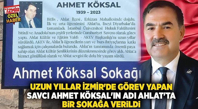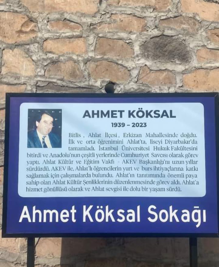 Gazetem İzmir - Burak Solak - Eski İzmir savcısı ve Yargıtay 7. Dairesinden emekli Ahmet Köksal'ın adı, memleketi Bitlis'in Ahlat ilçesinde bir sokağa verildi.