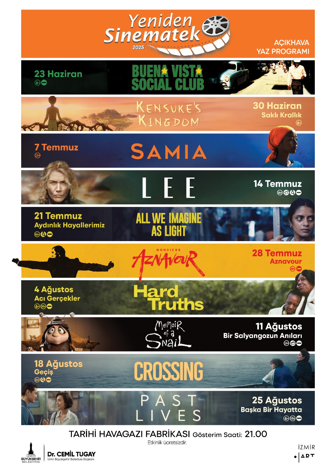 İzmirli sanatseverleri 16 yıldır sinemayla buluşturan İzmir Büyükşehir Belediyesi Yeniden Sinematek, “Açıkhava Yaz Programı” seçkisi kapsamında dünya sinemasından 10 filmi gösterime sunacak. Tarihi Havagazı Fabrikası’nda 23 Haziran-25 Ağustos tarihleri arasında pazartesi akşamları saat 21.00’de beyaz perdeye yansıtılacak filmler, İzmirlileri sinemanın büyülü atmosferinde yolculuğa çıkaracak. Yeniden Sinematek Açıkhava Yaz Programı, 23 Haziran’da Wim Wenders İmzalı Buena Vista Social Club filmi ile başlayacak.